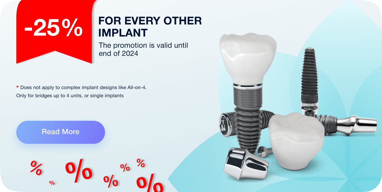 - Installation of four implants "turnkey" in case of complete absence of teeth + fixed orthopedic structure, beam fixation