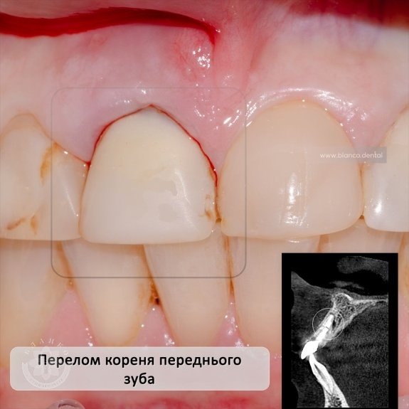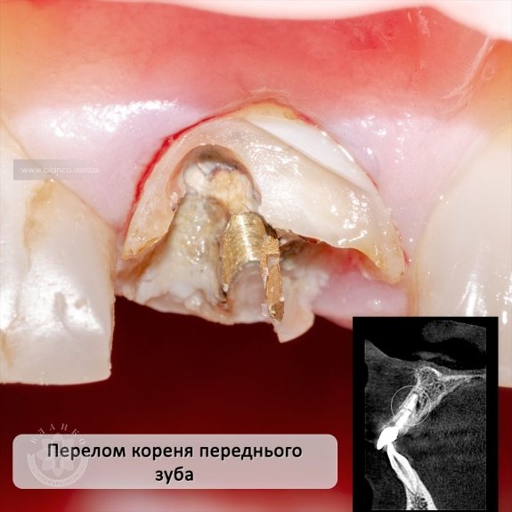 На комп’ютерній томограмі визначається фрактура (перелом) кореня зуба. Такі зуби відновленню не підлягають.